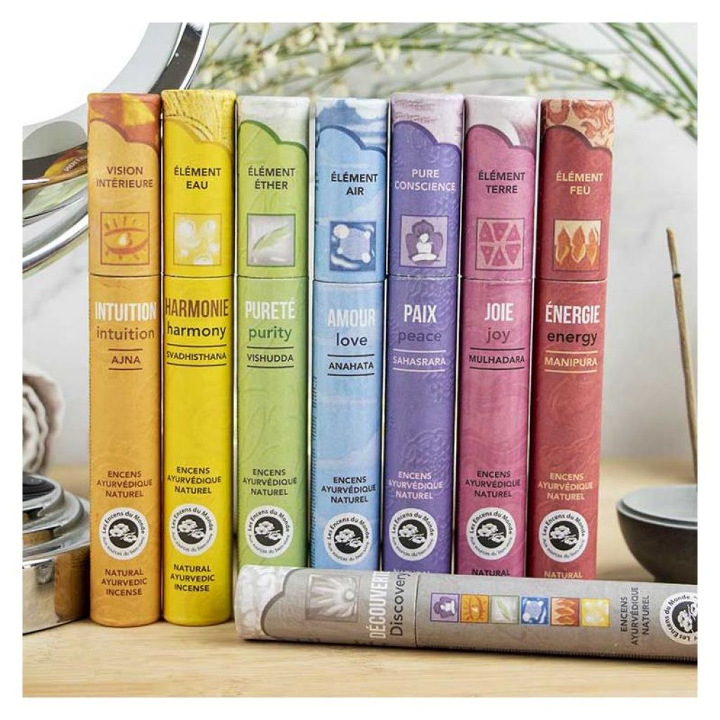 La composición de la gama de inciensos indios ayurvédicos sigue las técnicas del Ayurveda (medicina tradicional) y actúa sobre los 7 centros vitales, los chakras