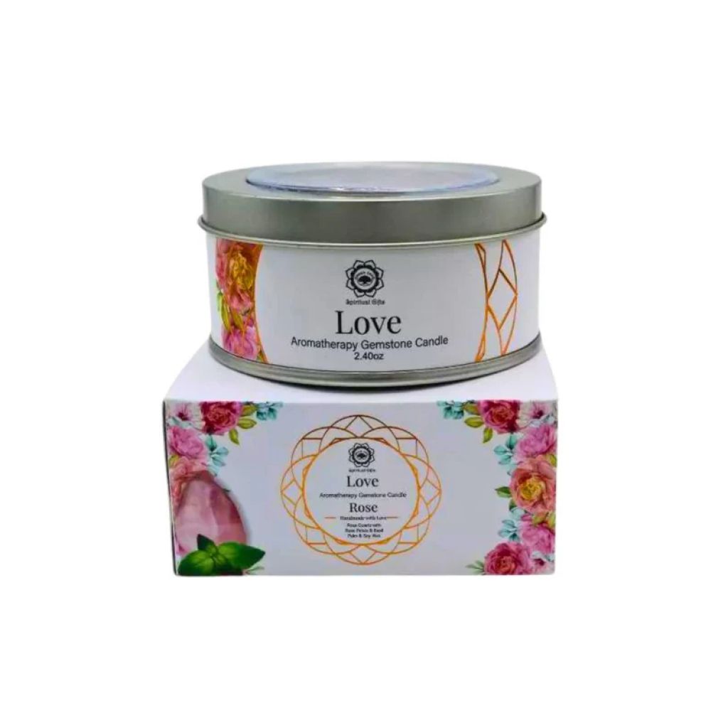 Vela lata con Minerales Cuarzo Rosa y Rosas